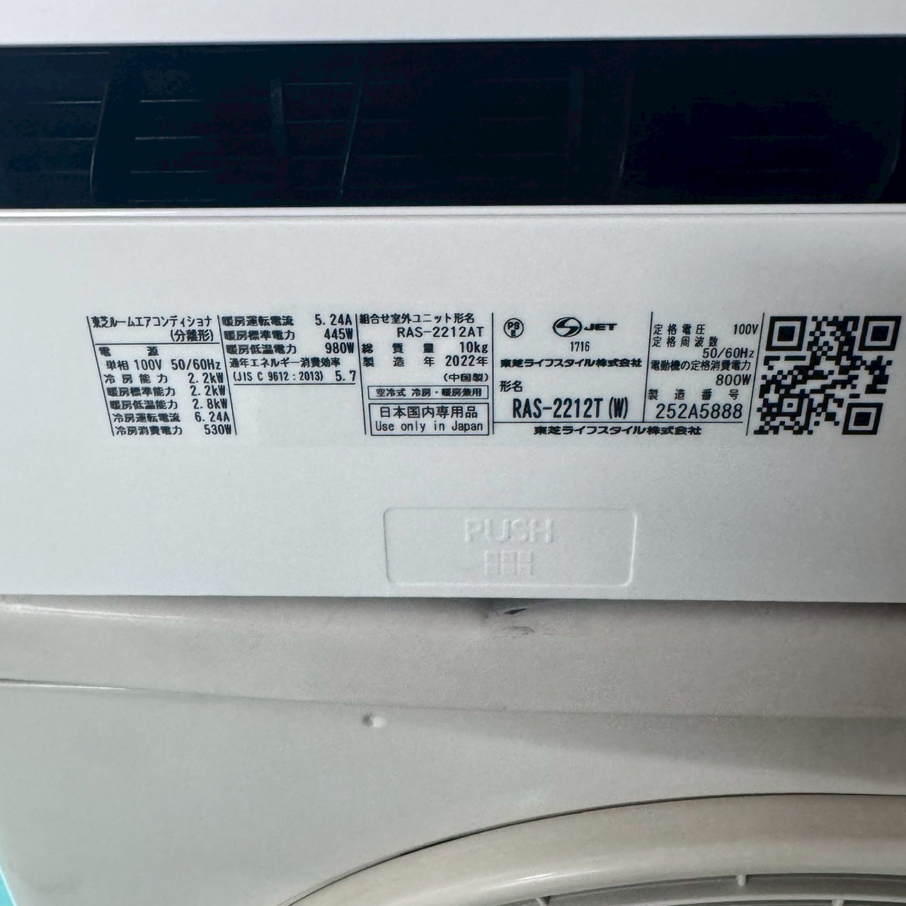 【中古エアコン】K06531 東芝 2022年製 RAS-2212T 主に6畳用