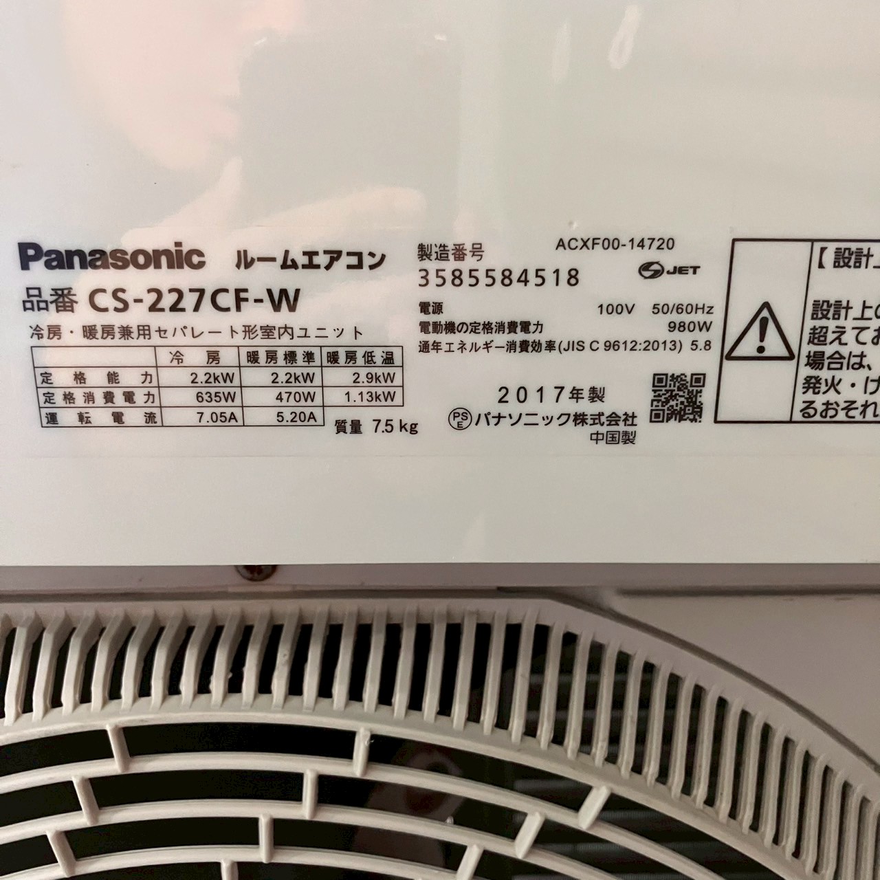 【中古エアコン】K06542 パナソニック 2017年製 CS-227CF 主に6畳用