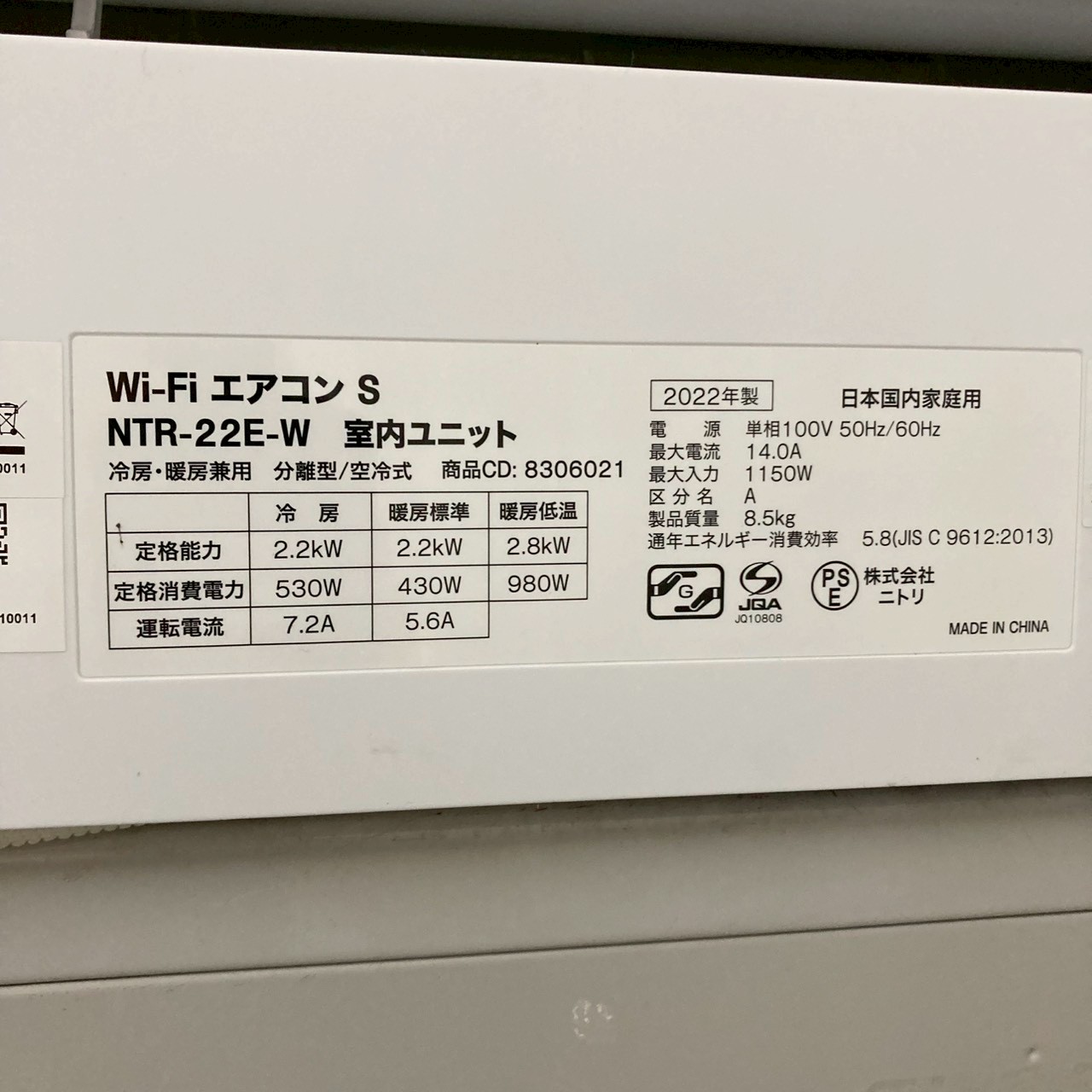 【中古エアコン】K06566 ニトリ 2022年製 NTR-22E 主に6畳用
