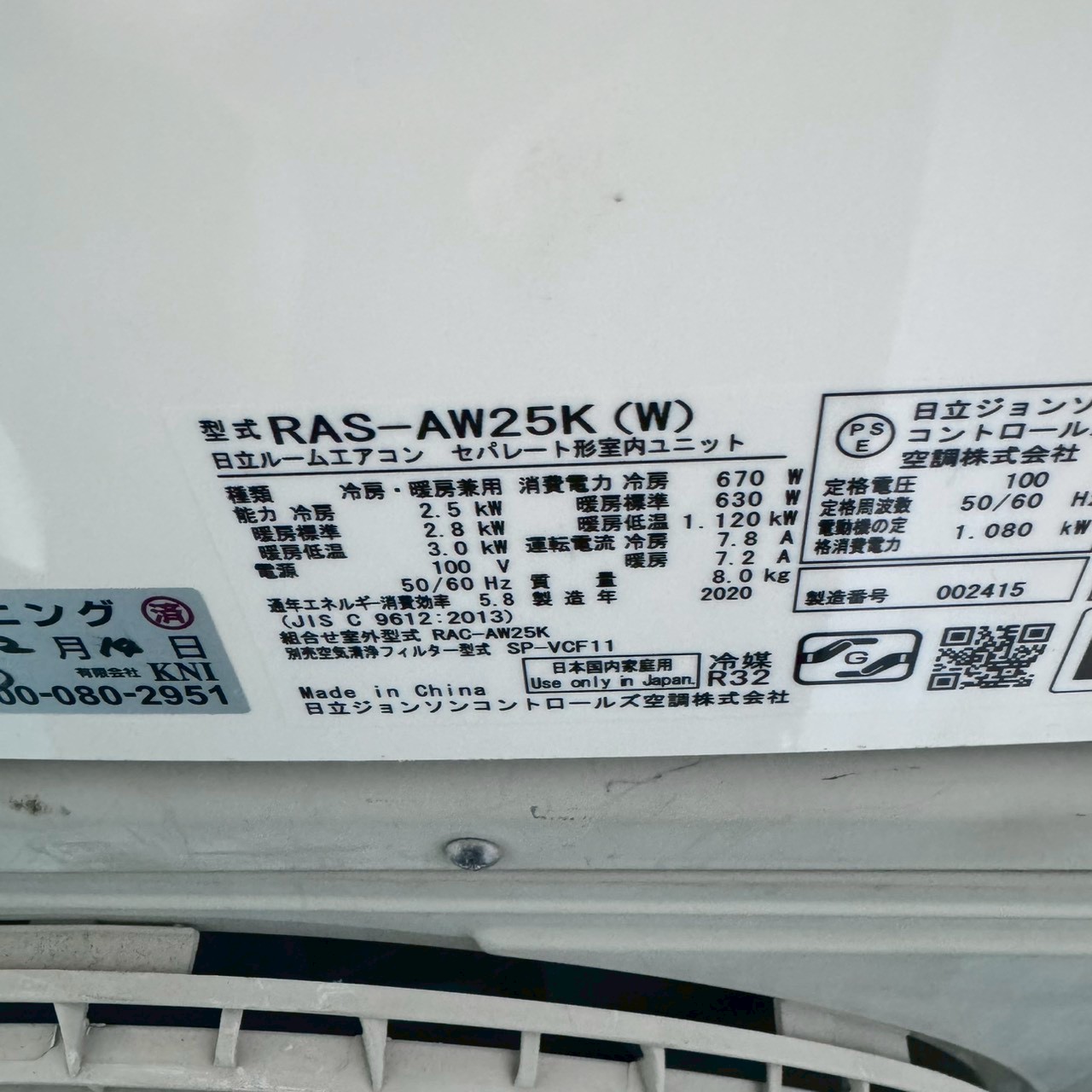【中古エアコン】K07107 日立 2020年製 RAS-AW25K 主に8畳用