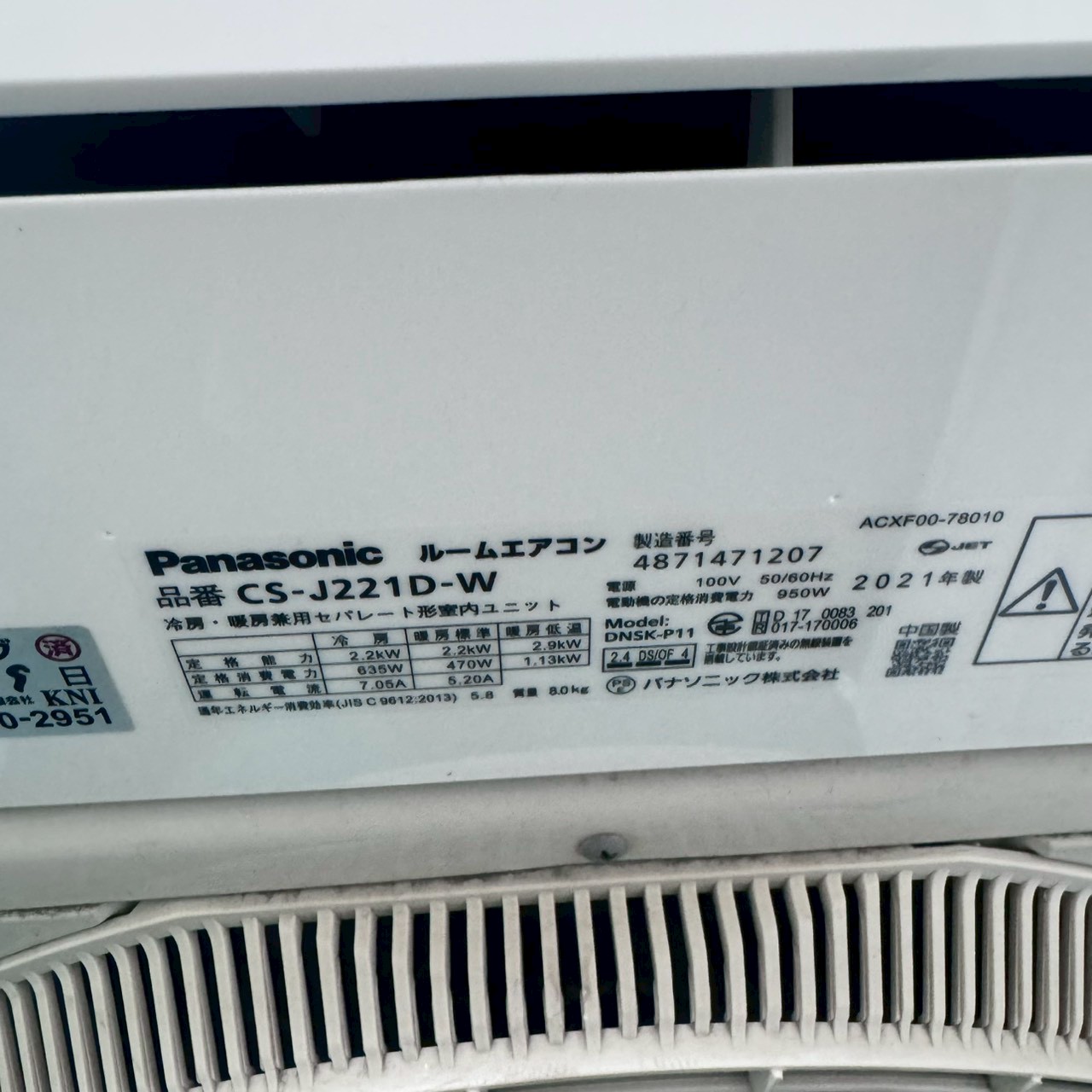 【中古エアコン】K07141 パナソニック 2021年製 CS-J221D 主に6畳用
