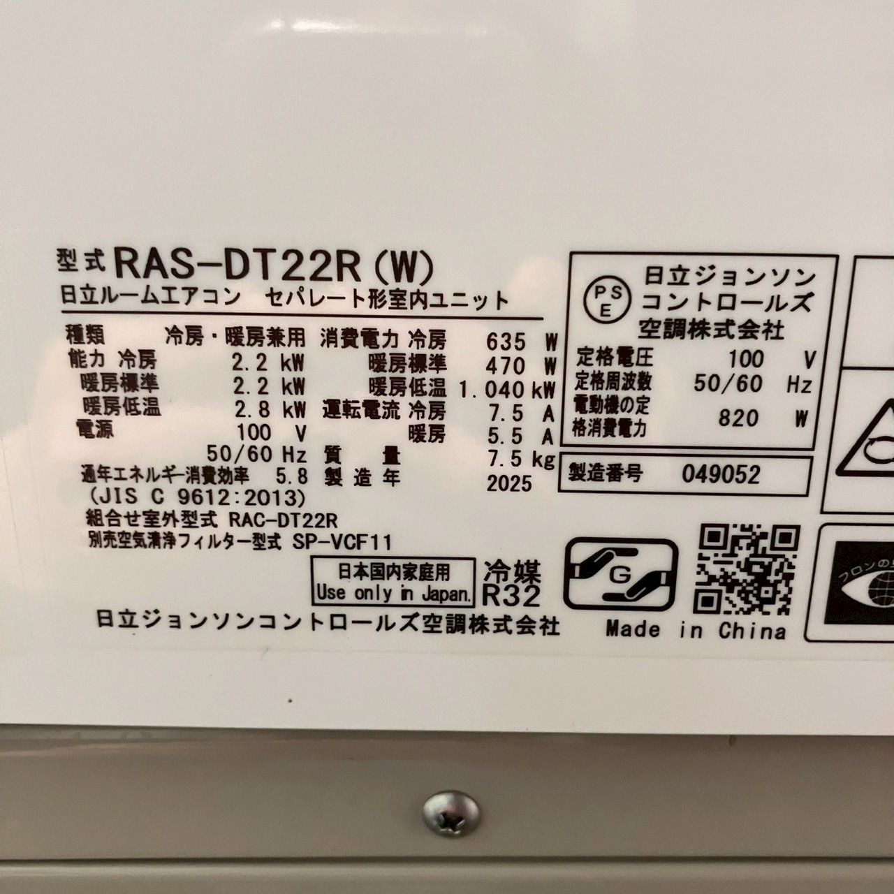 【中古エアコン】K07145 日立 2025年製 RAS-DT22R 主に6畳用