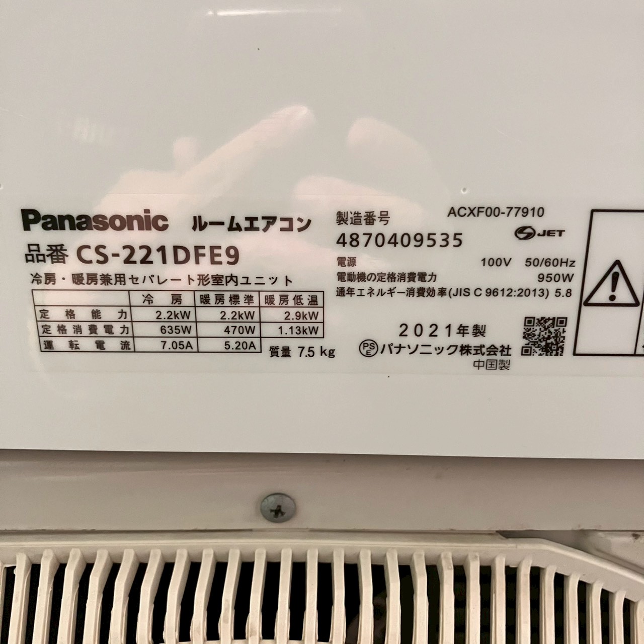 【中古エアコン】K07147 パナソニック 2021年製 CS-221DFE9 主に6畳用