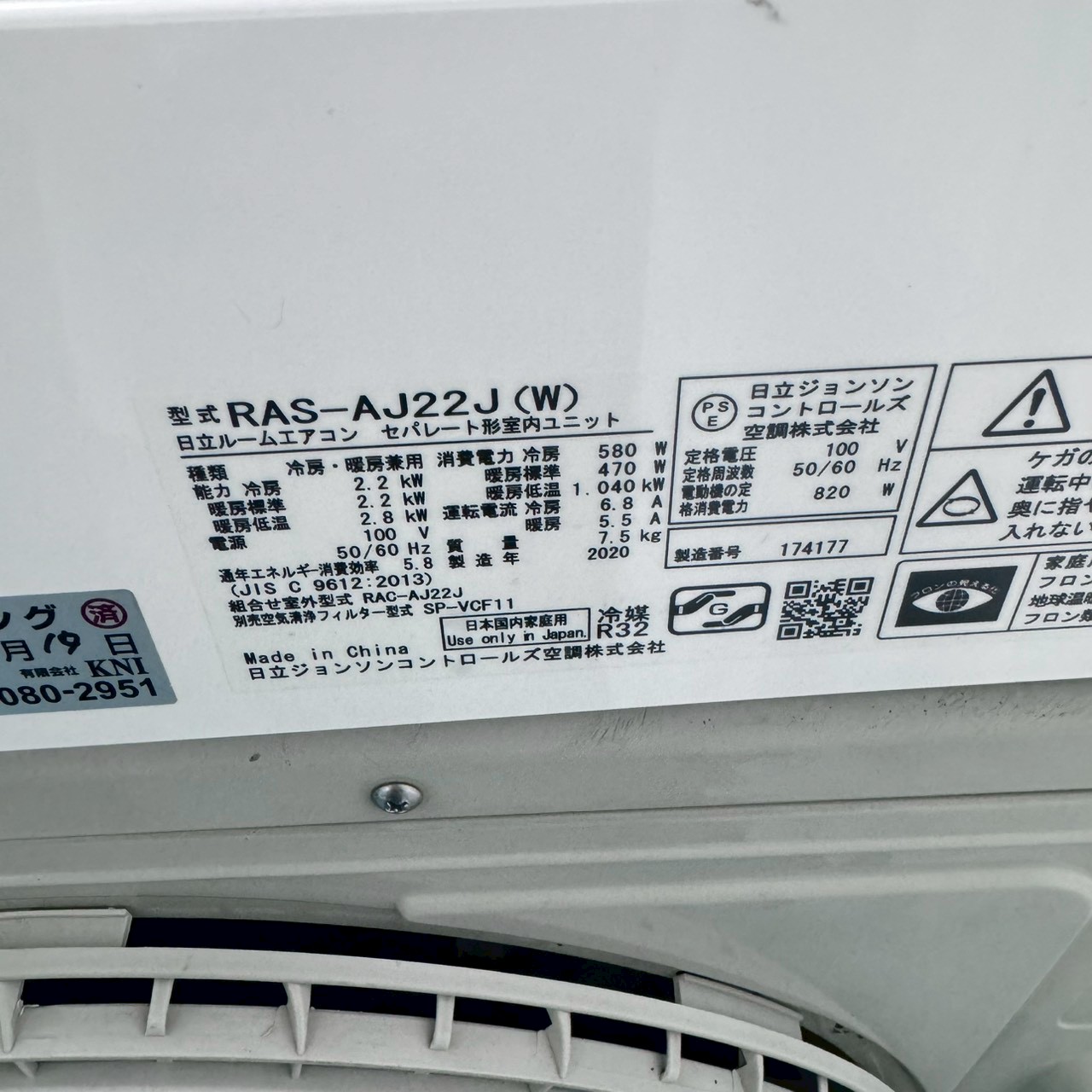 【中古エアコン】K07150 日立 2020年製 RAS-AJ22J 主に6畳用
