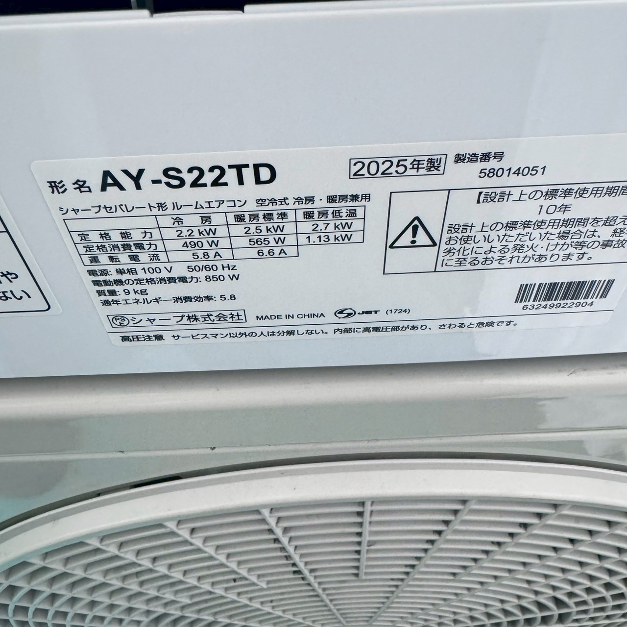 【中古エアコン】K07153 シャープ 2025年製 AY-S22TD 主に6畳用