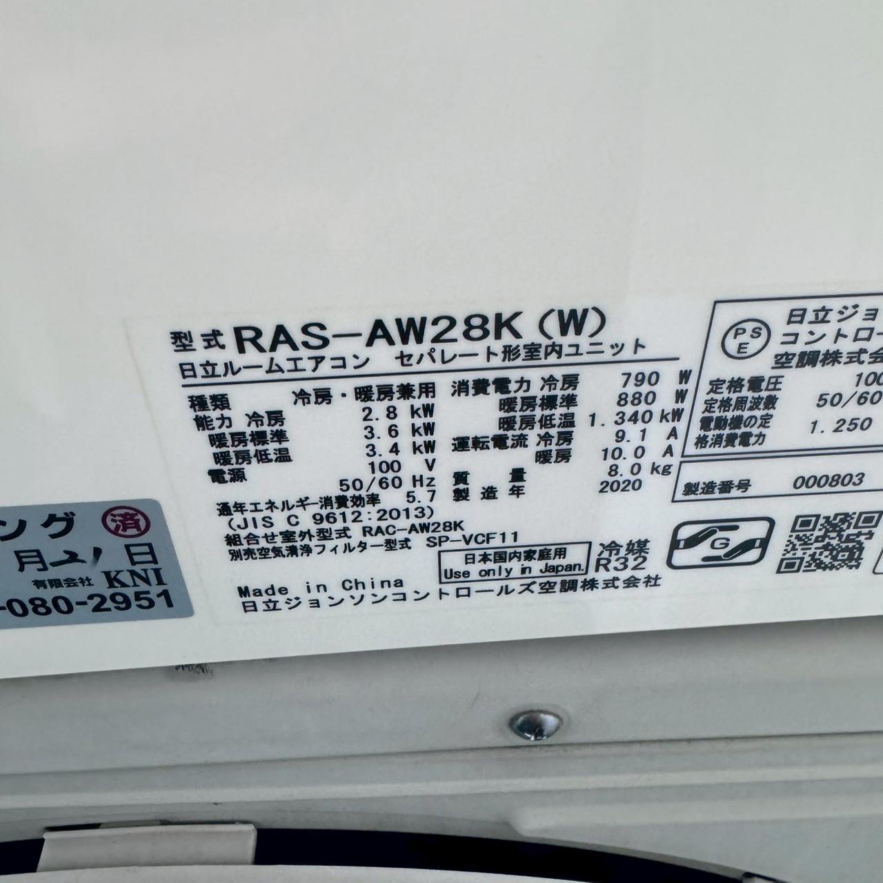 【中古エアコン】K07155 日立 2020年製 RAS-AW28K 主に10畳用